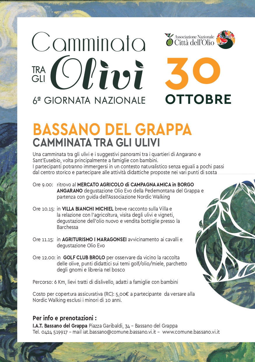 Domenica 30 ottobre Bassano del Grappa accoglie la VI Giornata Nazionale della Camminata tra gli Olivi: partenza ore 9.00 in Borgo Angarano, tappa a Villa Angarano per assaggiare l’olio della prima spremitura, per poi passare all’Agriturismo I Maragonsei e infine al Brolo Bassano Golf Club.